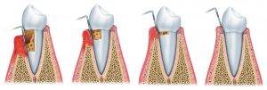 La periodontitis (antiguamente llamada piorrea), es una infección bacteriana producida por las bacterias existentes en la placa bacteriana y el sarro, estas bacterias producen la reabsorción de los tejidos de sostén del diente (hueso, ligamento y encía). Al perder sujeción, los dientes se mueven y finalmente se caen o requieren ser extraídos.